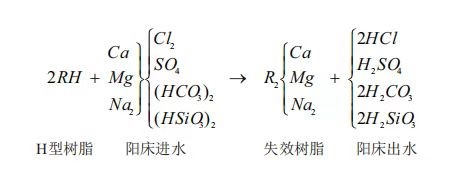 當(dāng)水通過陽離子交換器(陽床樹脂)時,水中的各種陽離子被樹脂中的H+,Na+離子交換后留在樹脂上,而H+,Na+離子則到了水中,鈉基樹脂一般用在軟化水處理中,鈉離子置換掉水中的鈣鎂離子,降低水中的鈣鎂硬度。氫基樹脂陽床離子交換器一般和陰床離子交換器共同使用,或者使用在混床離子交換器中。水中的陽離子被H+置換后,陽床出水含有H2SO4,、HCl等強酸,一級H2CO3,H2SiO3等弱酸,因此呈酸性,這些水進(jìn)入到陰離子交換器后,水中的各種陰離子被OH+離子置換,OH+離子被置換到水中,和H+離子結(jié)合成水,反應(yīng)式如下: